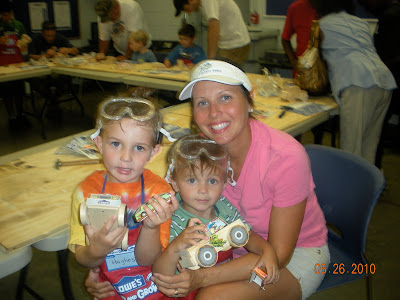Last Saturday, the boys and I ventured to Lowe's for their Kids Clinic to make our own monster trucks while David did yard work. It was our first time doing one of these clinics and we will definitely be back. The boys had so much fun. It was very interesting seeing them with kid-sized hammers, safety goggles, and aprons. I was a little nervous about the nailing but both of them did great. I did have to hold a few while the boys hammered but luckily for my fingers they hit the nail every time.
